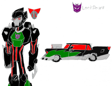 In Transformers Animated, Lockdown was once a student of Autobot Ninja Master, Yoketron, but was kicked out for bringing shame to the Corps. In retaliation, Lockdown lead a squad of Decepticons to the training center where he killed Yoketron and took his helmet. Lockdown would later confront the Autobot medic, Ratchet (whose EMP Generator he had stolen) while the latter was tending the wounded Arcee. Lockdown would eventually confront Yoketron's student, Prowl, who defeated him using the very upgrades the former provided him.
