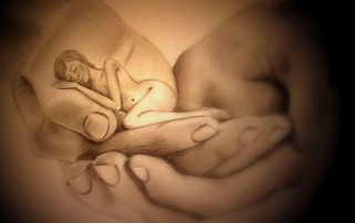 Of course, as I was teaching, I was making my own sculpture to demonstrate the various steps to her. However, when we reached the point of the hands being done, I decided to do another figure. It took me a long time to figure out how to position the child in the hands here to make the pose look natural, and finally came to this point.