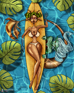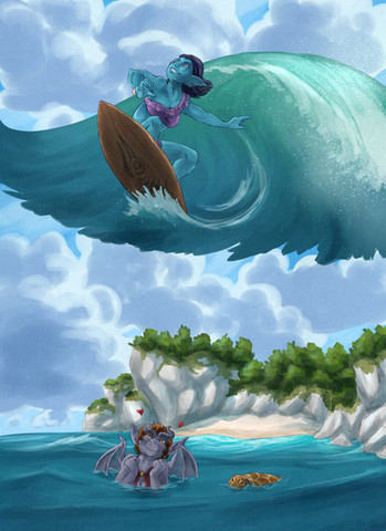 Welp! The IP Pageant posted a journal yesterday announcing the first round of the contest! Admittedly I was a tad bit TOO excited by the subject. Tikah happens to come from a tropical part of planet Vort, so being in the water is something she is well acquainted to. Not to mention it was fun to show her doing one of her favorite hobbies, other than tinkering with machines, surfing~!Tikah ain't really the type of girl to show too much skin in any circumstance. Surfing and water sports are no difference there. No bikini or anything like that for this girlie. All big ol wet suits and zippers. Cause she is just so ...Fun like that. No extra skin showing that isn't necessary.