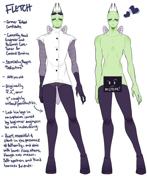 Part of his temperature issue might be caused by the fact that his body shape is a frail, thin body type. Rec is a small irken in all sense of the word. Both in height and in the way his body is built. To most he looks like they could snap him between their middle fingers with how frail he appears.