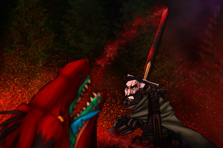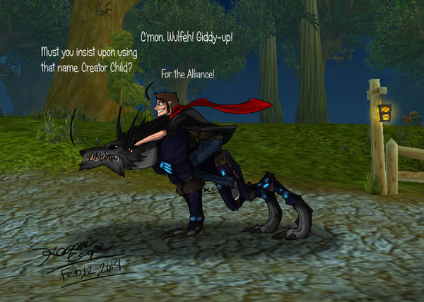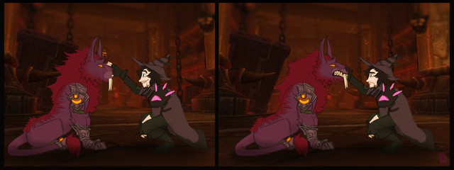 I'm working on some new story/comic ideas, and this is related to them. In this sequence, the ranger's mount stumbled upon a soulstone in the woods, the entity within influencing the creature with it's magic to crack the stone, the entity then flowing into the wolf, and possessing it. It's fur changed from a goldish brown to a potent blackish blue, purple veins appearing momentarily as it's body grew slightly.I won't say much of my ideas for this story, in the event that I never actually do it! : D So anyway, hope you like it!