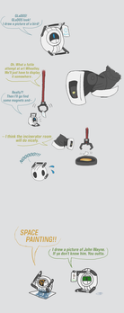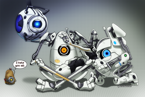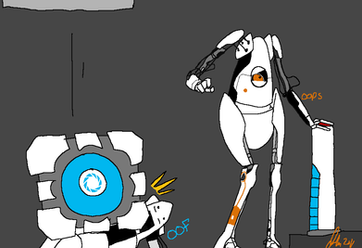 I'm writing a couple of Portal fics at the moment, and couldn't resist doodling the scene from one of them where Atlas and P-Body throw gel at GLaDOS for a giggle. (They're quite immediately disassembled. Violently. They consider it to be totally worth it.) Those bots are so hard to draw! D:We all know they love annoying her. If you haven't spent ages mucking about in front of the cameras to tick her off in Co-op, you...haven't Co-op'd, really! *laughs*