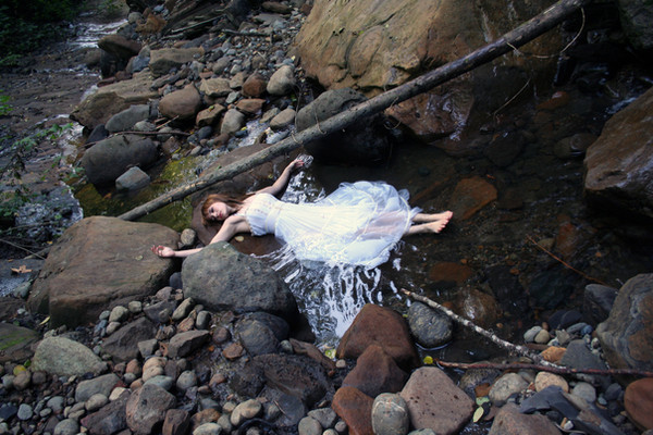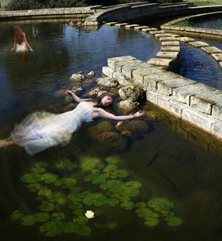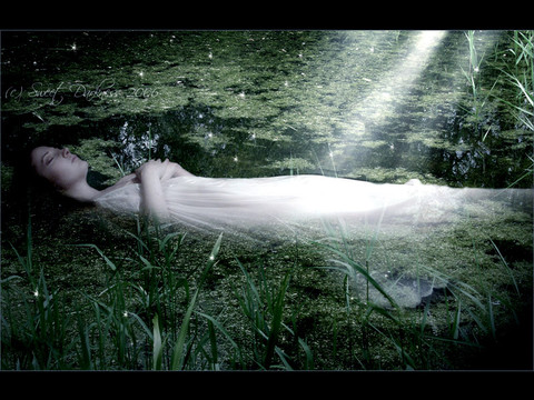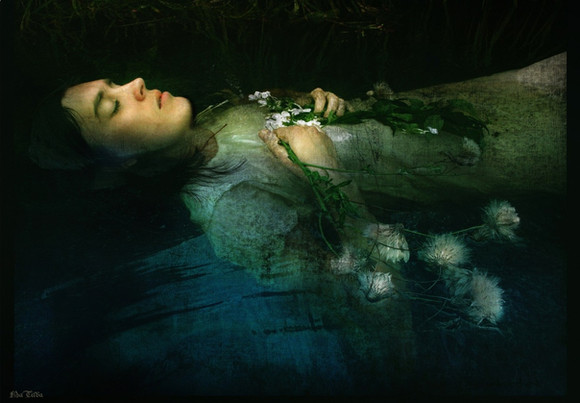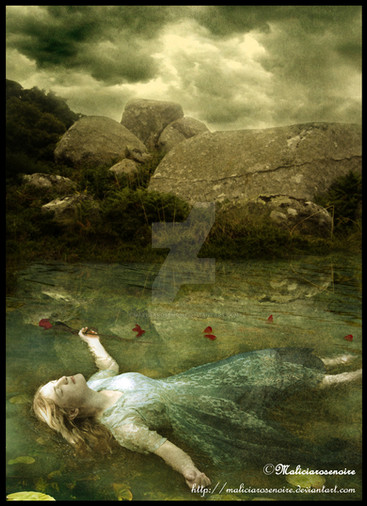 Millais' 'Ophelia' is, to me, one of the greatest paintings ever. this is my attempt to kind of replicate it, in my own style ..Ophelia is being played by lockstock , while the background is used by permission from fuzzymemo .
