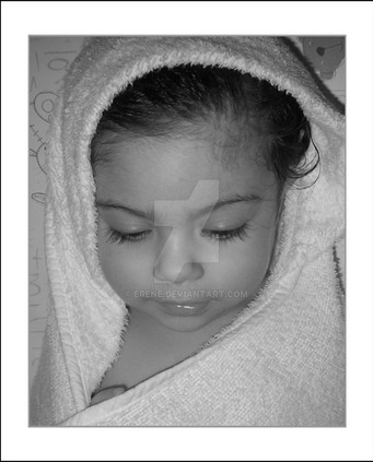 oh thats adorable! Love her wet hairl and the blanket. And her expression is precious! Great framing