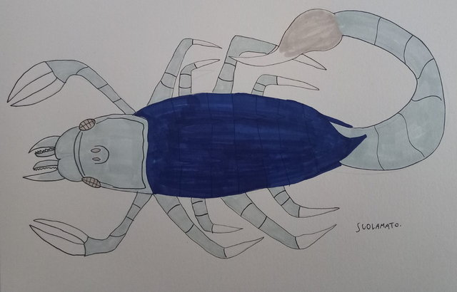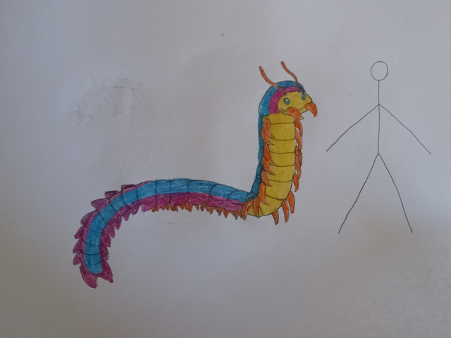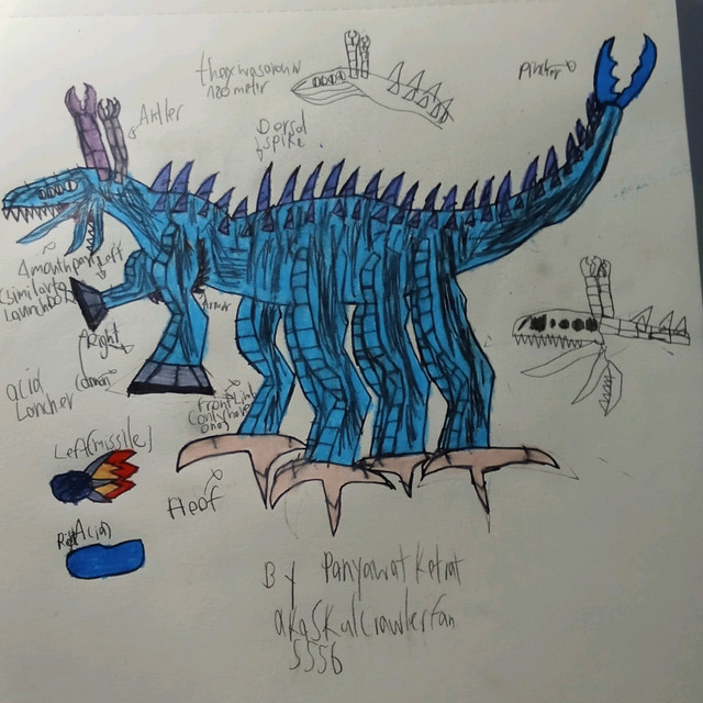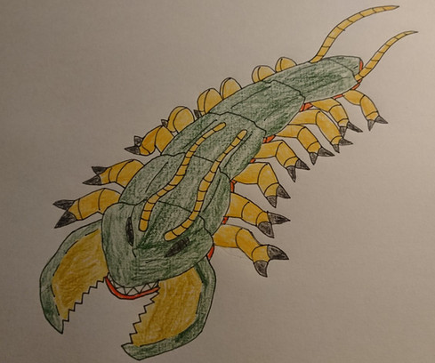 This enormous beast height up to 21.1 meters long in the residential buildings. Metal blue and the ash gray color scheme in the each segments, have blue eyes like a compound eyes of the arthropods. The legs are modified by evolving the legs were now six legs per centipede legs, the front legs were developed into the pincers like crabs, and the legs are modified to the flipper for swimming and now excellent swimmer. The tail is now a fluke similar to whales however shows of this tail breaching in the ocean occur the legs still. Antennae is developed by an anglerfish but is used for glowing to never been can't be see.