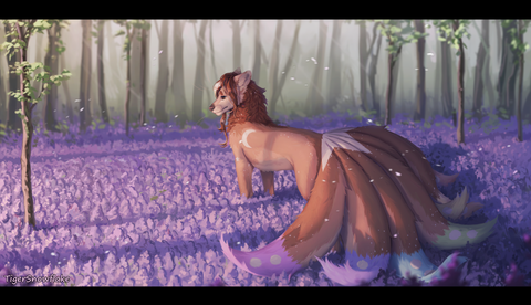 I have no idea how I missed this o.o; Absolutely beautiful work of art! I love all of the fluffiness you added to the tail x3 A little dampness for effect and that background is enchanting I love it, I am glad I finally stumbled on this! ^^