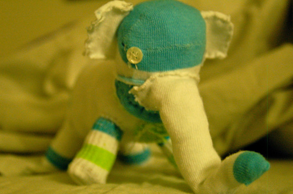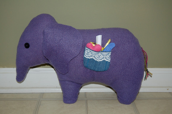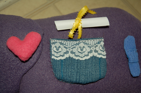 The mallet heads are facing outwards, and they also look ugly, so I covered them with little coverings I made out of fleece. On the left side is a duck, and on the right side is a turtle.
