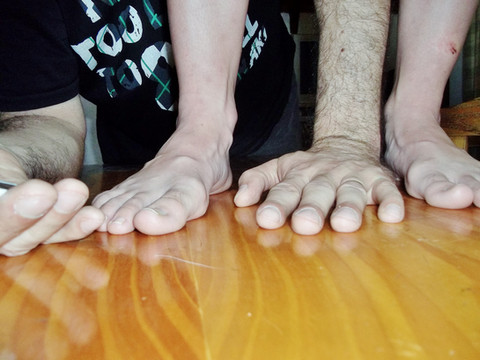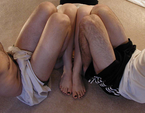 I just saw the full-size image and realized that the guy are on the floor on both your sides and not sitting behind you and that means there are two legs of one guy on one sides, two of the other on the other and two yours in the middle... You'll hex me for it, but seeing the thumbnail it looked like all the people in the pic were sitting on each other's lap *blush* and the boxers llying on the floor (at around the ankles, it would then seem) only made it more sinister...