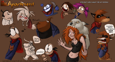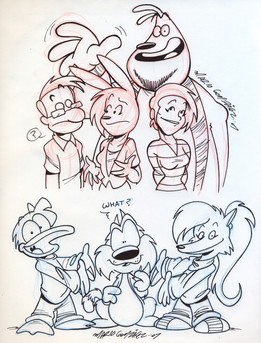 There they go again, making fun of me. I think the some of the humor behind Dawson Jesse and Leroy is that they can make fun of my style more than any other characters. I made a promise to myself, a resolution if you will, that I'd use Dawson, Jesse and Leroy in more pictures this year. This is the first result of that. Sure it's nothing much, after all it's just to get used to drawing the characters. Actually now that I think of it, this was to see if I could ink them in my current methods, and then color them in the scribble style. The refresher course on drawing them came in the form of a large pen scribble sheet that I have yet to scan.Related content