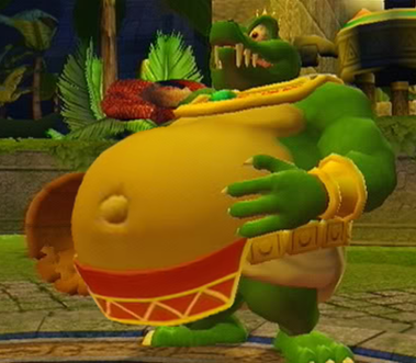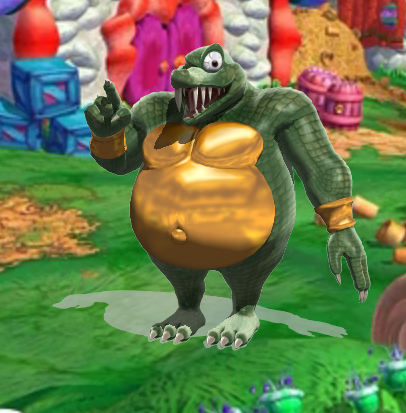 A green crocodile with a tan underbelly, gold wristbands, a crown and red cape.
