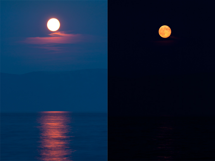 After batch, I just slightly edited color of the moon to match reflection in the sea, and color of a cloud. Even it maybe doesn't look very realistic, colors look OK to me, and it really reflects my memory