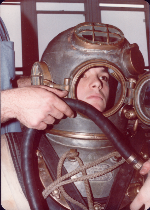 "Do you have any boots that are a little lighter?"US Navy Diver dressing in Mark V rig.