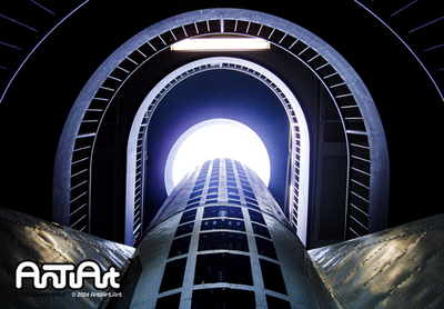 The whole piece is amazing and would be beautiful in and of itself. The architecture of the building is gorgeous and worth recognition alone, but the person walking (and lucky you--in the exact center!) really adds to the whole composition. It's amazing work.