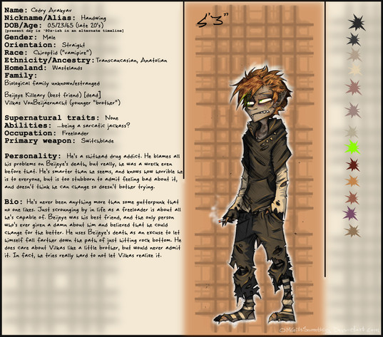 As is, I really don't have anything really worked out to bring her into the current timeline, she's mostly just a backstory character (but that may change. maybe. not sure.). Things did get better for her for a while, she had Beijeye to keep her company and basically considered him her kid, and actually did have some contact with Vilkas because Beijeye would bring him around (though she made a point of not letting Vilkas know she was his mother, because she didn't think he'd understand that she had to fake her death and all). But of course that all fell apart when Beijeye died. Things probably do eventually get at least a little better again, but it'd take a while.