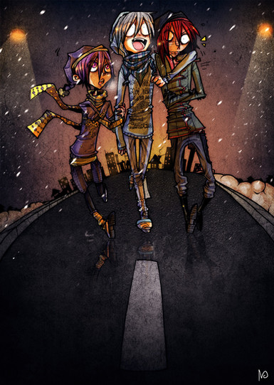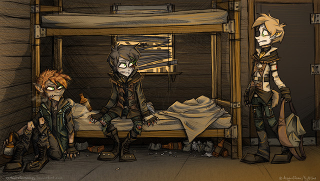 Sort of a redo. I sort of drew this before but with no background or anything. But I was messing around with how Fluffy and Requiyen stalk meet Vilkas, and I wanted to draw it more how they actually approach him. Completely creeping him out just to fuck with him.-----------------------------------------