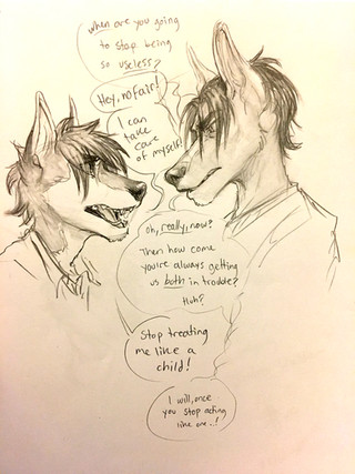 I came across a old short comic that I started but never finished; it was a joke that some friends and I had come up with, about someone going around trying to give a dead rat to people[... and got really weird in the end. I'll spare the details.]. I don't know, it was one of those things that was super hilarious in the moment but now I don't even remember half of it. But the dead-rat-gifting idea seemed fitting of something Twilight would have done.Twilight was obnoxiously persistent at forcing Vilkas to be her friend, to the point of creeping him out. Crescent is sheltered and squeamish, and didn't know what to think of her. Fenrir forever holds a grudge against her for humiliating him by intervening in a fight between him and Vilkas, his hatred of her only continues to grow when Vilkas does eventually become friends with her and she ends up being around all the time. I wanted to do a short comic of how she met Vilkas and his brothers, but I'm lazy...