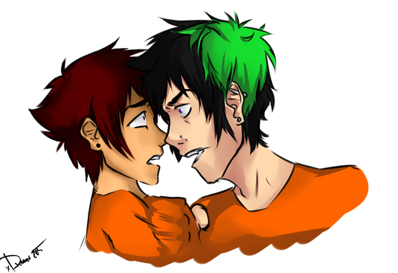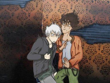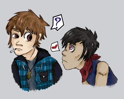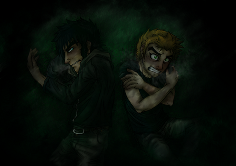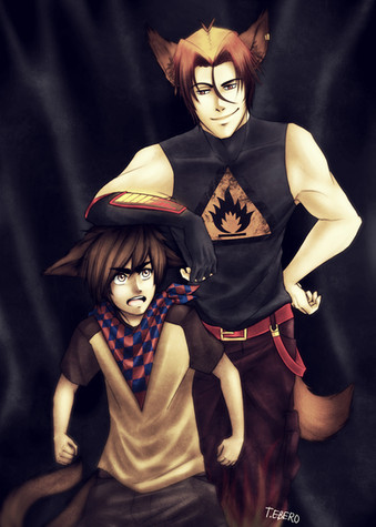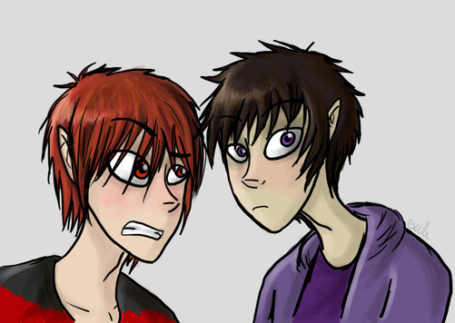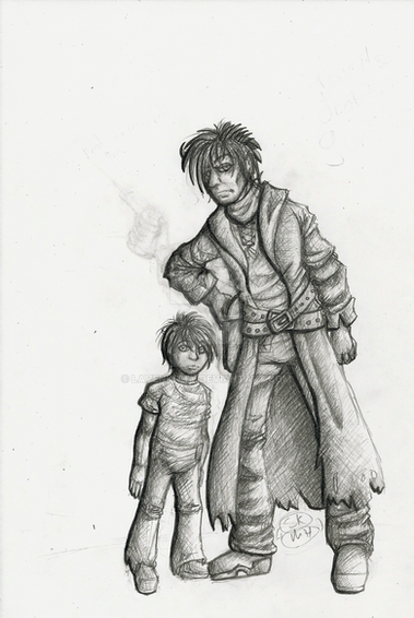 This took me entirely too long to finish... it's not even that it was so much to draw, because it really wasn't, my attention span was just being so stupidly short.But yeah, I never posted anything involving Ichibay (the kid Vilkas was later framed for killing). [Also, another excuse to draw Vilkas acting contrary to his usual paranoid demeanor.] The two of them were about 14/15 when they met and Vilkas was still pretty messed up over Beijeye's death; he ended up going through an angry, self-destructive, jerk phase (of course, Handwing almost seemed to get along with him better when he was acting like that). He was moved to a separate bunkhouse because he kept getting in fights, and started letting Handwing sneak in. But when Ichibay was transferred, the only space left, was with Vilkas. No one told Vilkas that he was getting a bunkmate, because they figured he'd just act out about it; no one warned Ichibay that he was getting stuck with the "problem kid", they just kind of hoped that since Ichibay was a medic trainee, rather than another fighter, it might be fine. They eventually got to be friends, but it took a while.