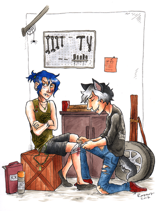 I really just wanted to draw something where their tattoos are visible (because they're total saps like that, of course they'd have matching bff tattoos XP), it's a small detail about them that I barely ever show, but I still like it. I had to really think of a context for it to even be a thing; especially with Vilkas, since he's not the type to be in the habit of casually going shirtless. But it's kind of hard for your best friend to bandage up your ripped open side with a bloody shirt in the way XPInitially, I had this in my head as just a random scene in which Vilkas has done something stupid and gotten his ass kicked, and shows up at Twilight's van needing to be patched up [and rant about whatever just went horribly wrong for him now].