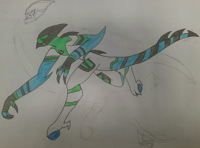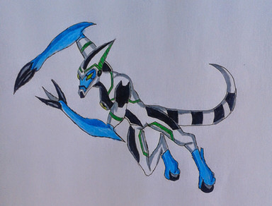 The people of Kinet are born in the most hostile environment you could ever even imagine, meaning they had to evolve to survive. This grants Drag Racer is ability of incredible speed through friction manipulation, his unique foot structure has two claws permanently gripped onto a small sphere that grants him more control. As he is currently a teenager, Drag Racer is complimented with other things such as a powerful tail and sharp arm blades.
