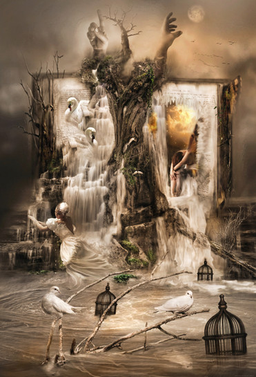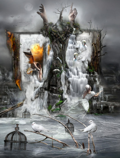 I see a tree in the middel in a body of water (a lake or something). The tree has some kind of a cliff on top with water running down it and the tree. In this water that's running down, there are some swans coming down with it. Behind all of this is a book with a huge square formed hole in it and in this hole there is a fairy sitting with her head on her arms. The reflection the fairy is casting though, is that of a normal girl.
