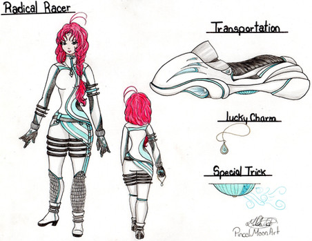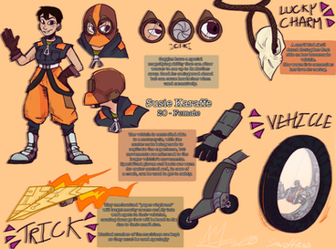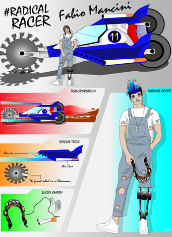 As for the racer I went for a modern/near future setting with a goth/gamer/tech design and an always cheerful personality. I like writing disabled characters a lot, since they force more creativity even in the 'every day' scenes, so here he is (you can think of it as a Jojo reference too). His personality has accidentally found its way into the descriptions on the drawing, but I think that showing one in a character sheet is a good thing, since this helps with transferring it into the character's body language.