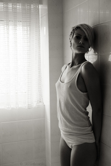 yeah the black and white does give it a real atmosphere. I really like that you're looking down and the way the light and shadow is falling gives you/your body/the picture a very delicate feel