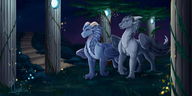 Here's a commission for !! Finished it today and I'm actually really happy with how it turned out, both in terms of lighting and the colors! Admittedly it took way longer than I'd like because I think it's been like three weeks since I started it? but it payed off and I managed to relax a bit so I'm not complaining!You guys know I barely ever draw backgrounds so actually starting to learn how they work is a cool process for me ^^.