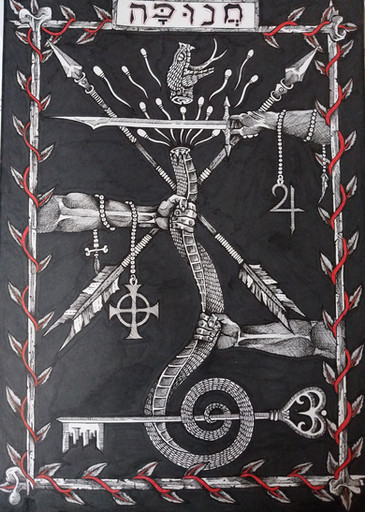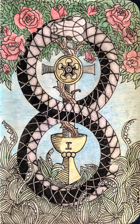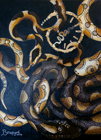 Mostly watercolor, used regular coloring pencils for the numerals on the clock. Supposed to symbolize our time running out on this earth. The snake is the imminent threat: The cataclysm. This is all a result of our human naivety.Related content