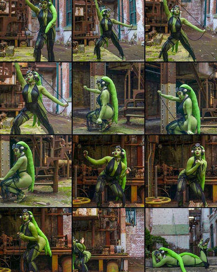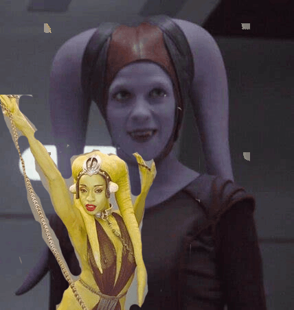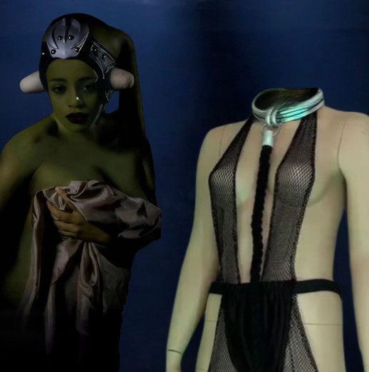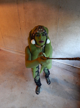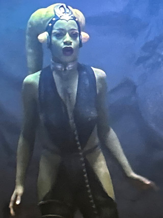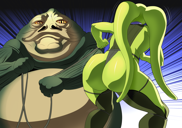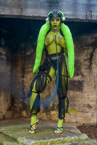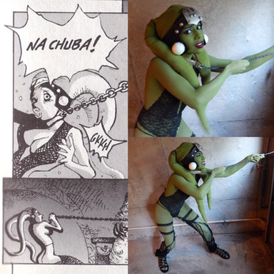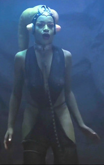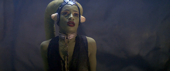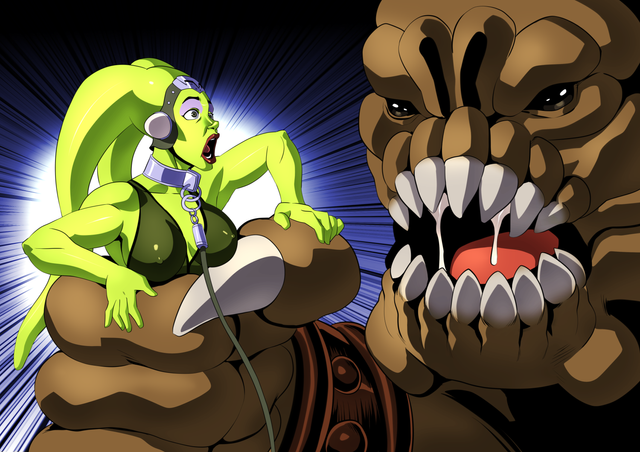 Jabba the Hutt drops his Twiβlek slave dancer Oola into the rancor pit using the trapdoor beneath the dance floor.Tiara Bree as Oola