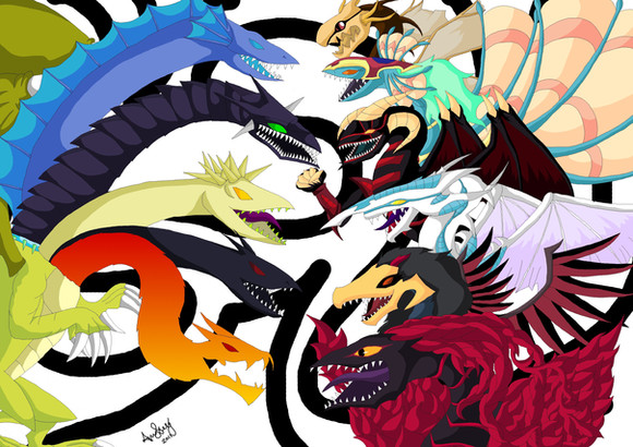 So, after seeing some of 's wonderful recent drawings of mythological heavy-hitters, I was motivated to work on this piece of my own that I've had sitting on my computer for at least a year or two now. I was just going to clean up the line art (which, admittedly, I could have done a bit more thoroughly) but I thought, what the hell, might as well color it too. Plus, I've been generally unhappy with the more dull, matte colors I've been using, so I wanted to try being more colorful. I think I accomplished that and I'm actually pretty pleased with the result. So yeah, in the future, I think I'll try to keep things more colorful.Anyway, for the picture itself. I had this idea for a fighting game, kind of like Primal Rage. The playable characters would be the biggest and baddest monsters from each mythological pantheon. The general story would be something about a dying multiverse. Each universe would have one native religion (i.e. a universe where Greek mythology is real, a universe where Egyptian mythology is real, etc), but each universe would be dying (from some undecided threat). Things have gotten so bad that the only survivors of each universe are the strongest gods (Zeus, Odin, etc), escaping on their strongest monsters. They all flee their own universes and find themselves in some sort of inter-dimensional surviving pocket world. Setting the stage for the game, the remaining gods command their beasts to do battle, to see which pantheon comes out on top and who survives the cataclysm.