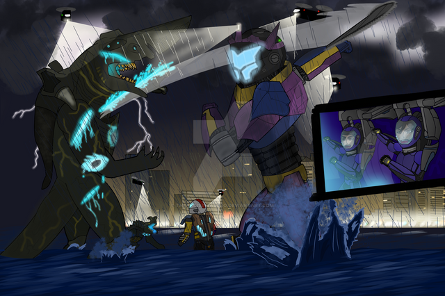Anyway I figured I'd take Titan to lend Gipsy a helping hand at this point, probably because Knifehead might be my favorite of the kaiju. Also I threw in a monster from the show to even the odds. But they can handle it. I rarely do backgrounds, but I figured this one needed it. Tried some new things and, like I said, I'm really happy with how it all came together. Hope you all enjoy!