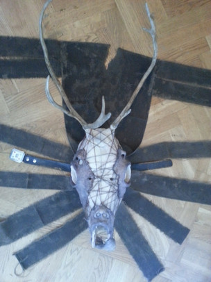A fantastic shot of my Steampunk Hussar uniform seen at Steampunk World's Fair 2014. This is part of a set taken by the Amazing Nick DiMatteo.Here is a detail shot of the Sabretache. My Wife and I took turns with the hand embroidery and I did the leather working. The field is red wool with gold metallic thread embellished with a bullion patch, brass skull stamping, three silver skull nailheads and hinged hardware. My initials make up the large motif, with golden spiderwebs to frame them.