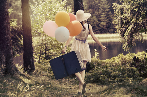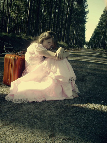 The choice of colors for the outfit and the luggage in contrast with the background works well. The way she's sitting at the top of the luggage as if it's not high up at all is intriguing. The entire photo is lovely. It's like a triangle within a rectangle. Awesome composition, color pallet, concept, etc. I could random more but, I ran out of compliments to give