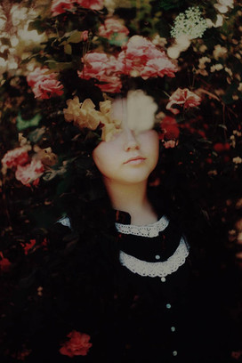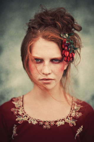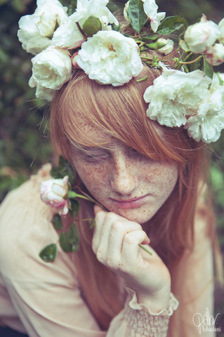 I love everything about this piece. The contrast of the eyes and flowers. The freckles on the face with the dots on the shirt. The hair flowing into the shirt. The center symmetry.. Well thought out and creatively unique piece. No complaints!