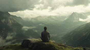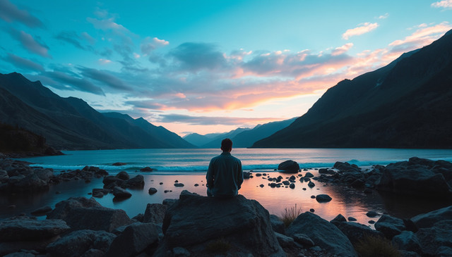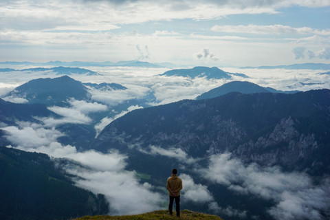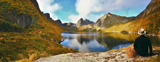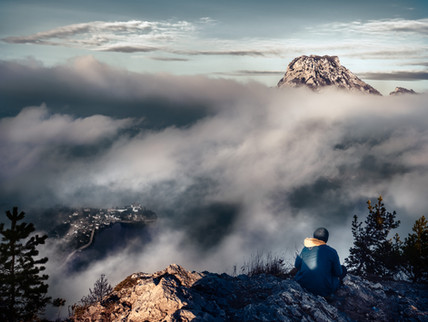 The man sitting is at the perfect spot (where the lines meet) ! I also like the way his arm extends the cliff on the left. I believe his sitting posture remains humble and contemplative towards nature, so I actually enjoy to see this human here: it shows there isn't always an opposition human/wild.