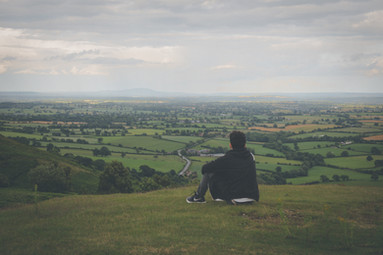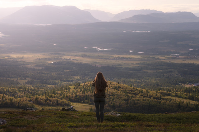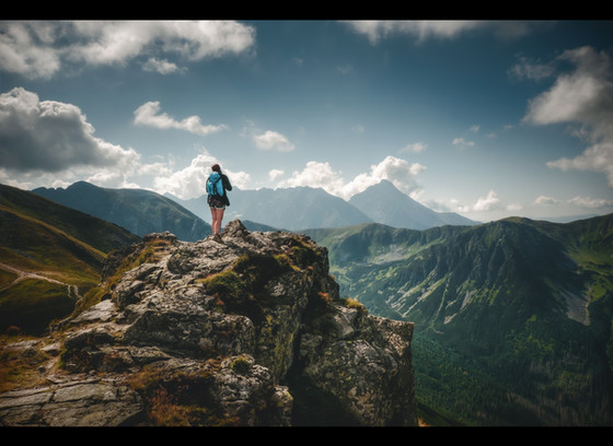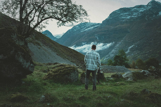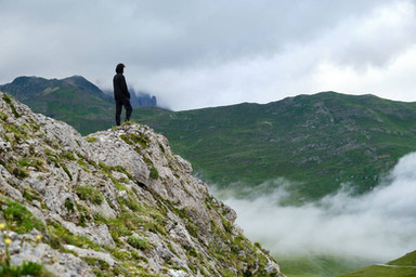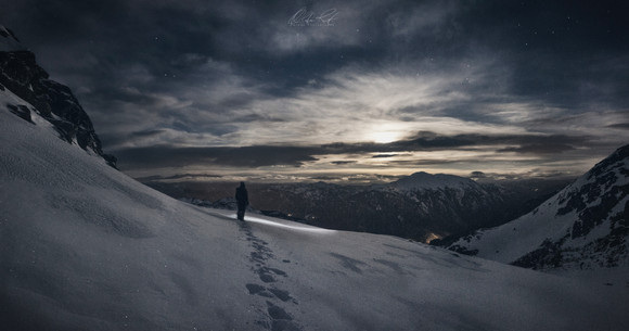 Beautiful photo!! I love the colors and the composition.... how the person is placed in relation to the valley, the mountains, and that stream of melted snow, with the clouds parting just so at that precise moment - beautifully done!!!