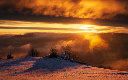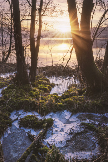 It is a wonderful scene full of appealing, soft autumn colors, brown and golds and shadows and snow. The small tree in the foreground is a very nice focal point and the light coming through the clouds is lovely, as well as the sparkle on the lake, but what would improve this photo very substantially would be if the sky were not in soft focus--if the rays of the sun were more defined. I can't tell whether it was intentionally softened, but speaking for myself, it would be dazzlingly beautiful if there were not such a difference in focus across the depth of the picture.