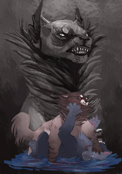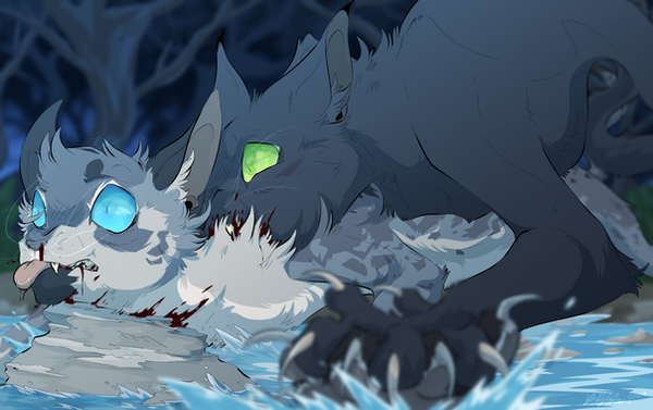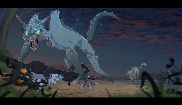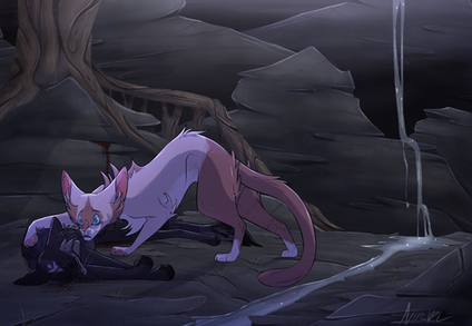 Second time drawing this scene. Honeyfern and Poppyfrost were a last minute add. I was also gonna add Brokenstar in there but I couldn't find a good spot to put him... so imagine he's already disappeared or is somewhere infront of Breeze and Jay. I know in canon the moonpool is described as a small natural made quarry type thing with a small waterfall, but I've always pictured it as a cavern carved out by an ancient river that eventually dried up. The only remains of that river being the moonpool - kept full by run-off water by the mountains and rain water. The moon shines on the pool through a gap in the ceiling of the cavern.