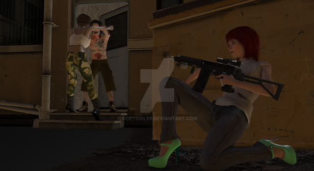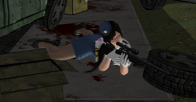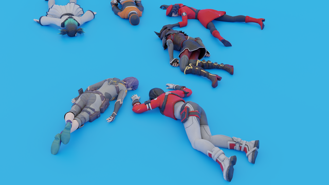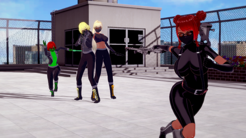Tina and Mila flirt over the unconscious bodies of Officer Leifang, Hitomi, Marie Rose, and Honoka. Tina handled the cadets while Mila handled the seasoned veterans.Models