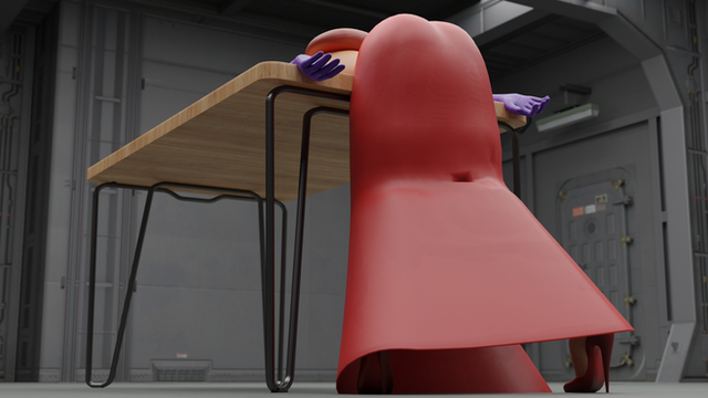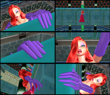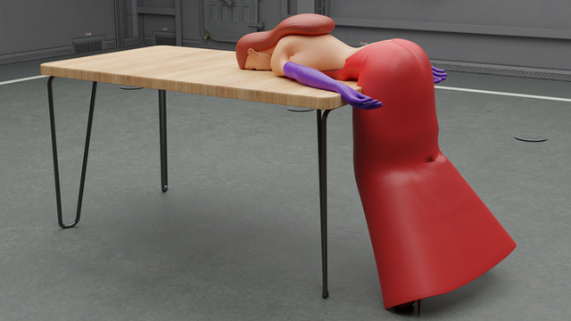 Jessica Rabbit lays unconscious on a table, bent over onto her face.Model by dawadd