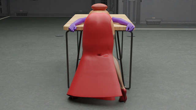 Jessica Rabbit lays unconscious on a table, bent over onto her face.Model by dawadd