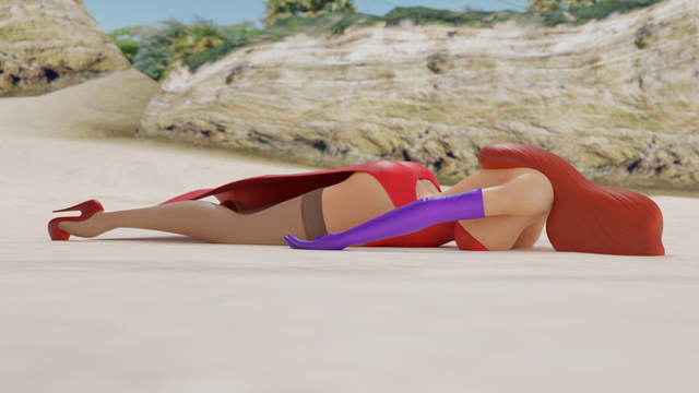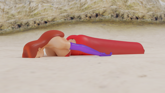Jessica Rabbit lies face down on the beach.Models