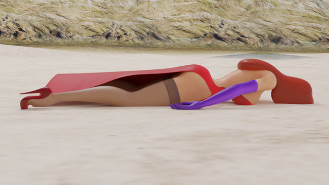 Jessica Rabbit lies face down on the beach.Models