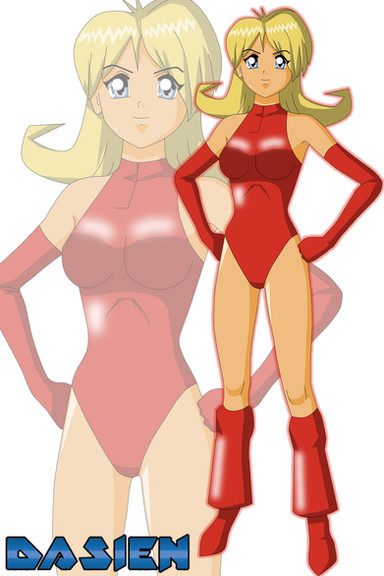 Me recuerda a Clover de Tres espias sin limite por el cabello y justo tiene traje rojo, aun que el de ella es enteriso