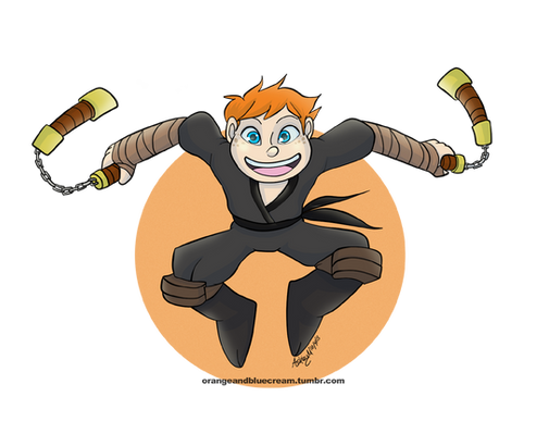 He's a kid not a chibi.. around 6 or so, I know it wouldn't be good for a kid to be holding weapons, but I really wanted to draw them with their signature weapons.