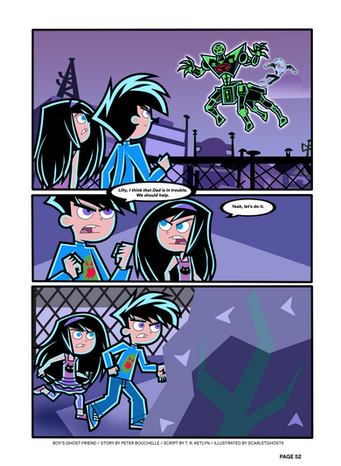Just to clarify why Danny & co. are in the ghost zone in the first place...the Fenton scanners (come on they HAVE to have those) picked up a weird and massive energy reading so they sent Danny in to investigate. Turns out, it was a Lyoko tower...Previous: Page 4