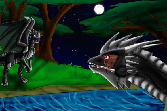 But he knew he couldnt outrun his older sister. He passed only couple of trees when she pinned him down, and viciously scratched the side of his neck. Her claws dug deep to his skin, cutting through his scales as if they were from paper. Harkin let out a painful howl, and filled with pain looked into eyes of his sister. "It wouldnt end up like this, you know..." Areneye purred, "if you were cooperating, I would spare you." She said, her sanity completely gone now. Harkin smashed his free front paw with all of his might into her face, hitting her right eye. Areneye hissed and let him go. Harkin jumped up and ran again. "You will regret you did that!" yowled outraged Areneye, chasing him once again. Harkin ran fast, but he was losing blood from his wound and got tired quickly. He saw a river running through the forest, and raced to it. When he reached it, his sight was already turning blurry, but he did not give up and jumped across the stream. When he hit the ground, he collapsed on the shore and was too beaten up to stand up again.