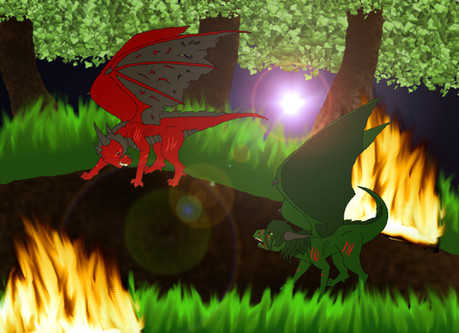 Quiet breeze was flowing through the dark forest, the leaves of many trees were rustling, the day was quite cold. A bird was sitting on a branch of a great oak tree, just to be scared off by a sudden movement down on the forest floor. A skinny red-scaled adult dragon, with golden plates on his neck and stomach, with grey curved horns and sharp spikes running down his spine, was pushing his way trough some bramble bushes with his broad shoulders. He let his sharp tail blade slice through the bushes he just walked through, leaving a leafy mess on the grassy bellow his feet with sharp hooked claws. He shook his whole body to get rid of some leaves that got stuck between his crimson shiny scales, and continued his journey through the forest. He was very thin, you could go ahead and count all of his ribs, see every muscle working as he was walking. He was starving.