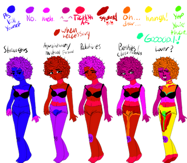 VQ:The Veggie QueenΒ already doesn't like being touched. But, if you manage to be able to get ahold of her without her socking you in the mouth, then these are the spots to look for. She isn't the type for holding hands, and she doesn't like being grabbed or "manhandled" also she doesn't appreciate when people put their hands on her face or near her belly-button. That's just rude.