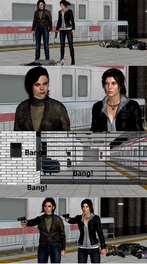 "Did you find anything on your patrol?" Scarlet asked as she walked over to the sewer grating."I had to escort three refugees to the police station," Raven replied as they bent down to look into the sewer. Scarlet noticed the rat-man's body lying dead in the sewer water.